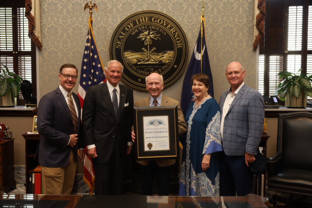 David E. Vipperman III, ’62, received the Order of the Palmetto on August 28, 2025, honoring a lifetime of service to his community, state, and country. A former U.S. Air Force pilot and Vietnam veteran, he flew more than 100 combat missions over North Vietnam and was awarded the Distinguished Flying Cross. Pictured (from left) are Vipperman’s son, Jonathan K. Vipperman, ’93; S.C. Governor Henry McMaster; Vipperman; his wife, Betsy Kloo King Vipperman; son, Maj David E. Vipperman IV, USAF, ’90; and Houston O. (Buddy) Motz, CGC ’24.