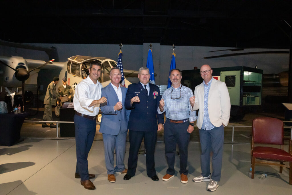 Col K. DeWalt Alderman, USA, Ret., ’98, retired from the U.S. Air Force on Aug. 1, 2025. Pictured at his retirement ceremony are classmates and friends (left to right) Col Peter A. Tortorici, Jr., USAF, ’96; Dr. Drew D. Farmer, ’98; Alderman; Lt Col Stephen L. Schein, Jr., USAF, ’97; and Col Ronald W. Schier, Jr., USAF, ’98. Alderman’s new role is as senior operations manager at CarolinaPower in Columbia.